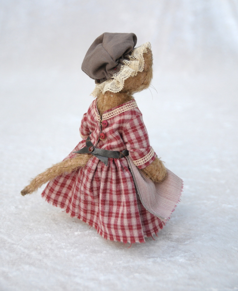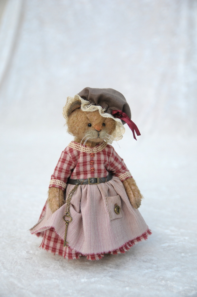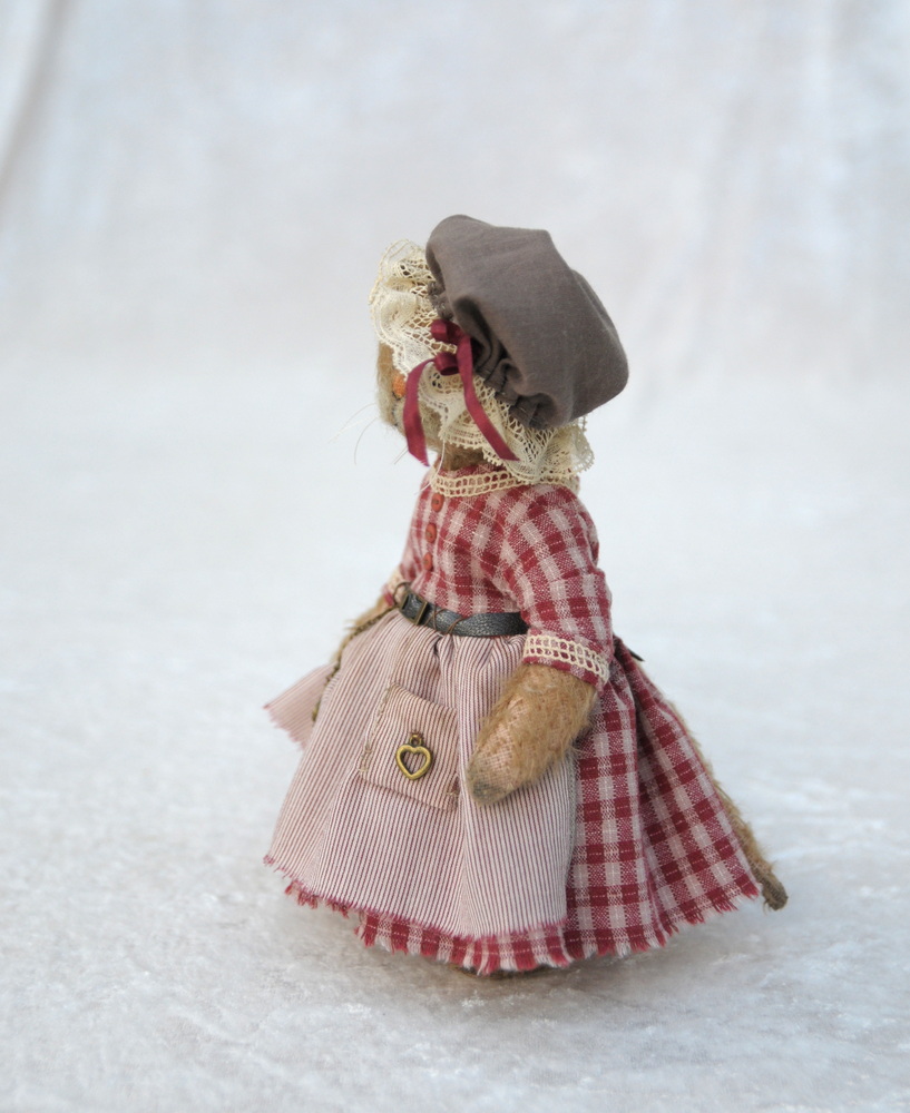 Tous mes ours ainsi que les habits sont fabriqués par moi-même à la main, avec des matériaux de qualité, spécifiques ours de collection. La matière interne est composée de ouatine spéciale ours et de billes d’acier. Ses yeux sont en verre et son nez brodé en coton DMC. Sa tête, ses bras et ses jambes sont articulés. Elle est habillée d’une robe avec tablier, d’une petite coiffe et d’un panti.